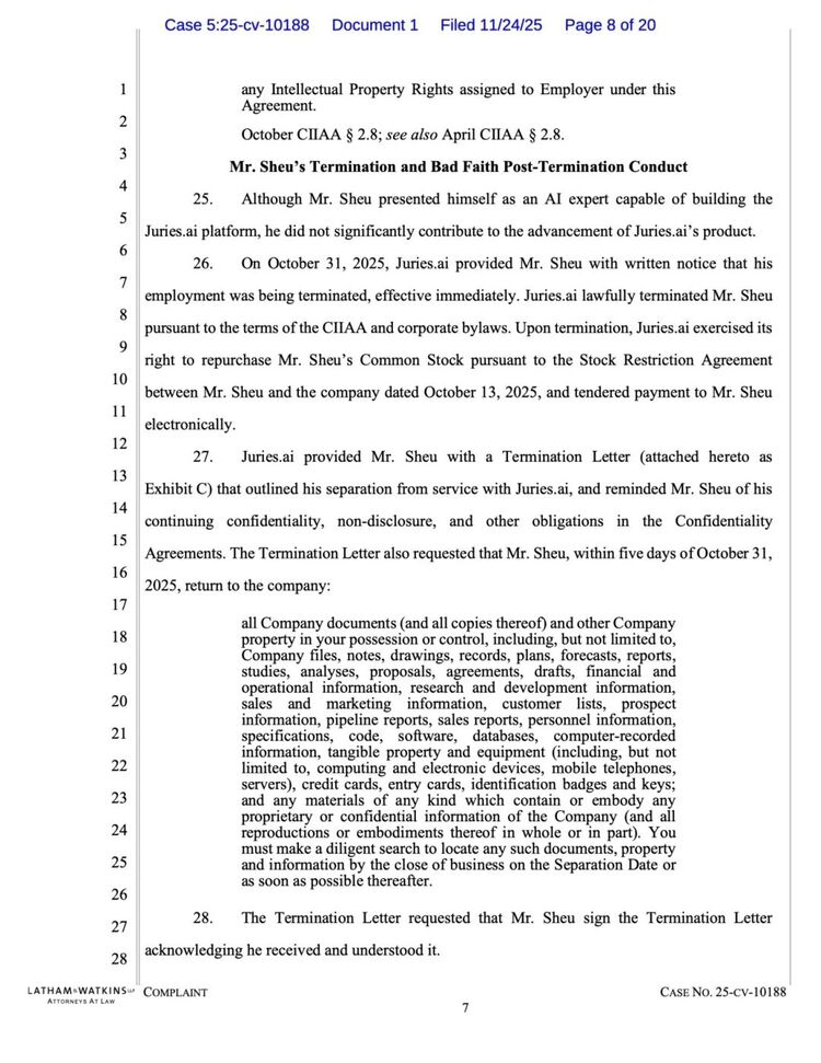 诉讼称这家初创公司于10月解雇了Vincent Sheu,并指出"尽管Vincent Sheu自称是能够构建Juries.ai平台的AI专家,但他对Juries.ai产品的推进并未作出实质性贡献"。