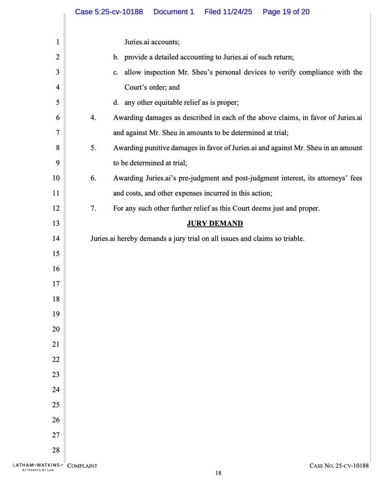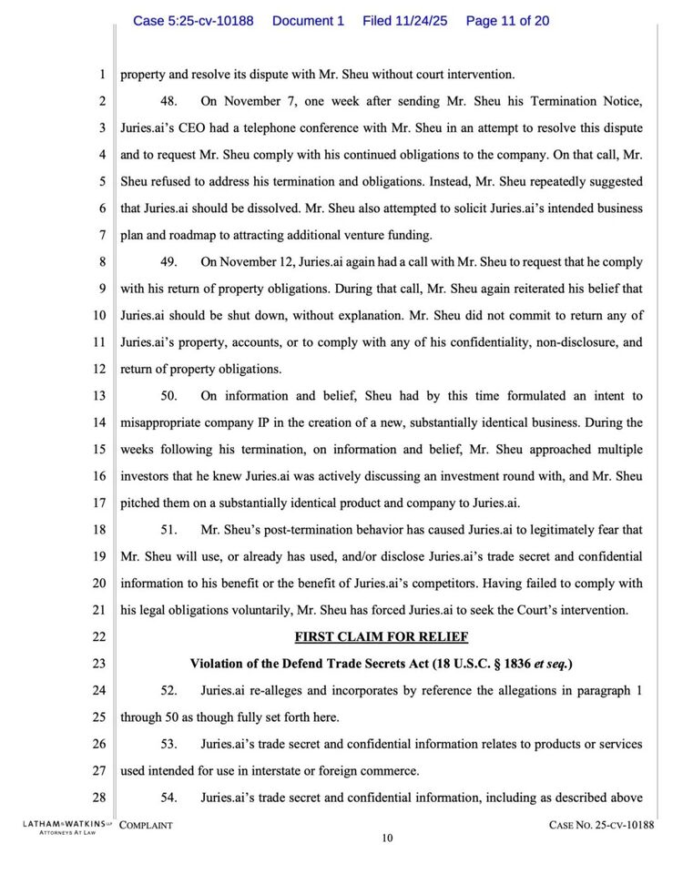 诉状显示,Vincent Sheu拒绝归还公司机密信息,干扰公司专利申请,并接触Juries.ai投资者以推销"实质性相同"的平台。Juries.ai请求法院颁布禁令,禁止许滥用其商业秘密,并索赔未具体说明的金额赔偿。