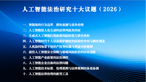在议题发布环节,来自全国多所知名高校、科研院所的专家学者分别就智能体的行为边界、授权机制与竞争治理,人工智能拟人化互动的法律风险及回应,生成式人工智能幻觉致损风险防范与责任承担,人工智能时代个人信息保护制度的结构性冲突与制度调适,人机协同场景下知识产权等权属与利益分配规则,前沿人工智能安全保障与极端风险防控的法治进路,人工智能产业政策的法治调控,人工智能企业出海的法律问题,人工智能技术标准、伦理准则与法律规则的体系协调,以及人工智能法律治理的新型工具等十项议题进行逐一发布,深度解读各议题核心内涵、研究价值与破题方向。