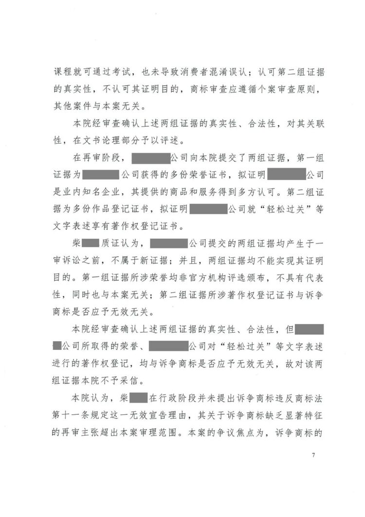 再审中,柴某提交的考试通过率报告及北京某科技公司自宣文章等证据显示,相关考试难度大,而“轻松过关”商标易对消费者购买决策产生实质性影响。
