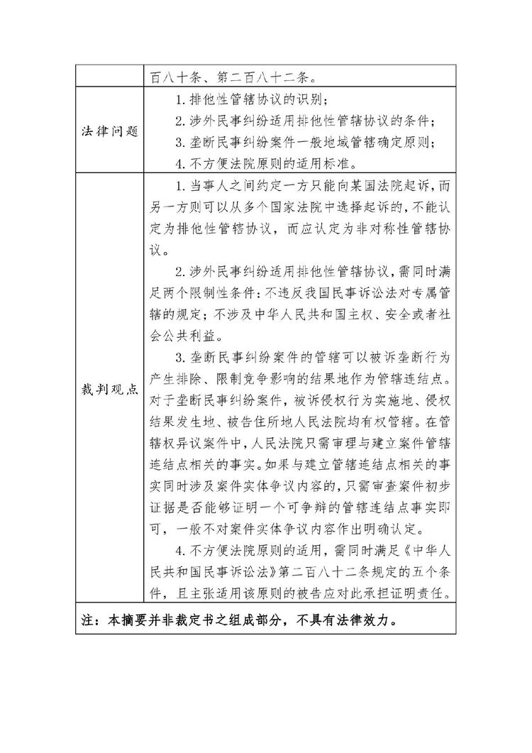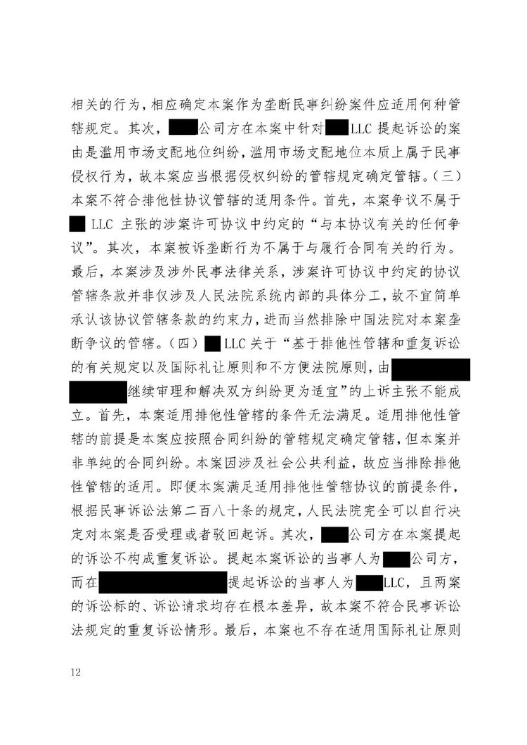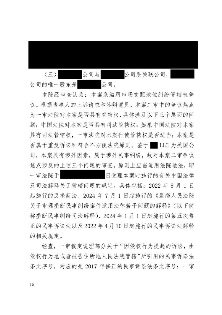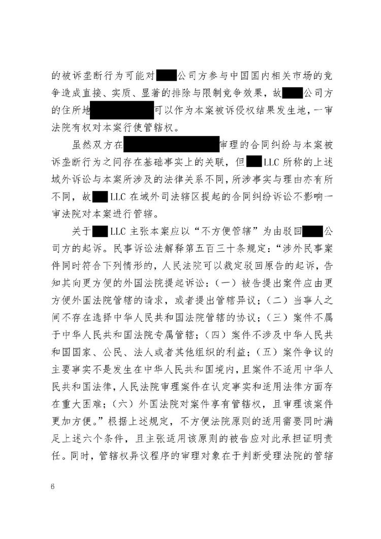 2、本案不符合“不方便法院原则”。该原则的适用须同时满足《民事诉讼法》第二百八十二条规定的五项条件,且由主张方承担举证责任。本案被诉垄断行为的损害结果发生在中国,涉及中国市场竞争秩序与社会公共利益,且美国LLC未举证证明中国法院审理明显不便或外国法院审理更为便利。因此,其主张不能成立。