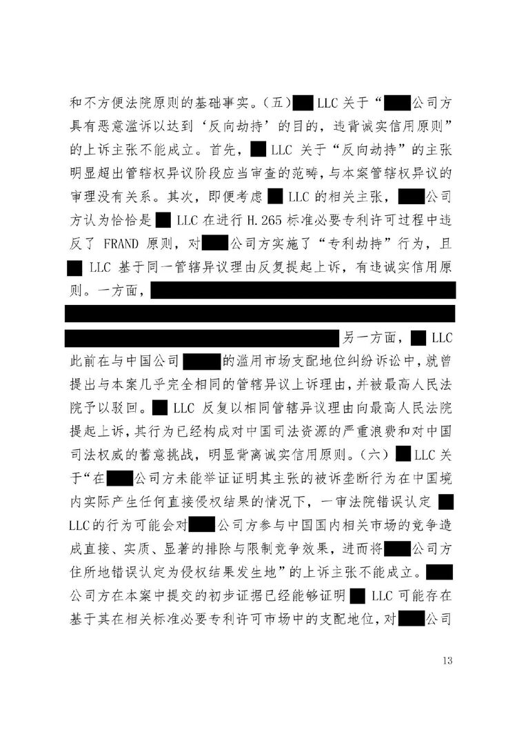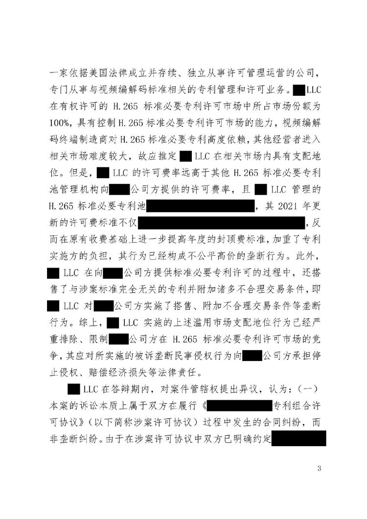 被上诉方系中国国内知名企业,主要从事相关技术产品业务。美国LLC是一家依据美国法律成立的专利许可管理公司,负责管理H.265视频编解码标准必要专利池的许可事务。