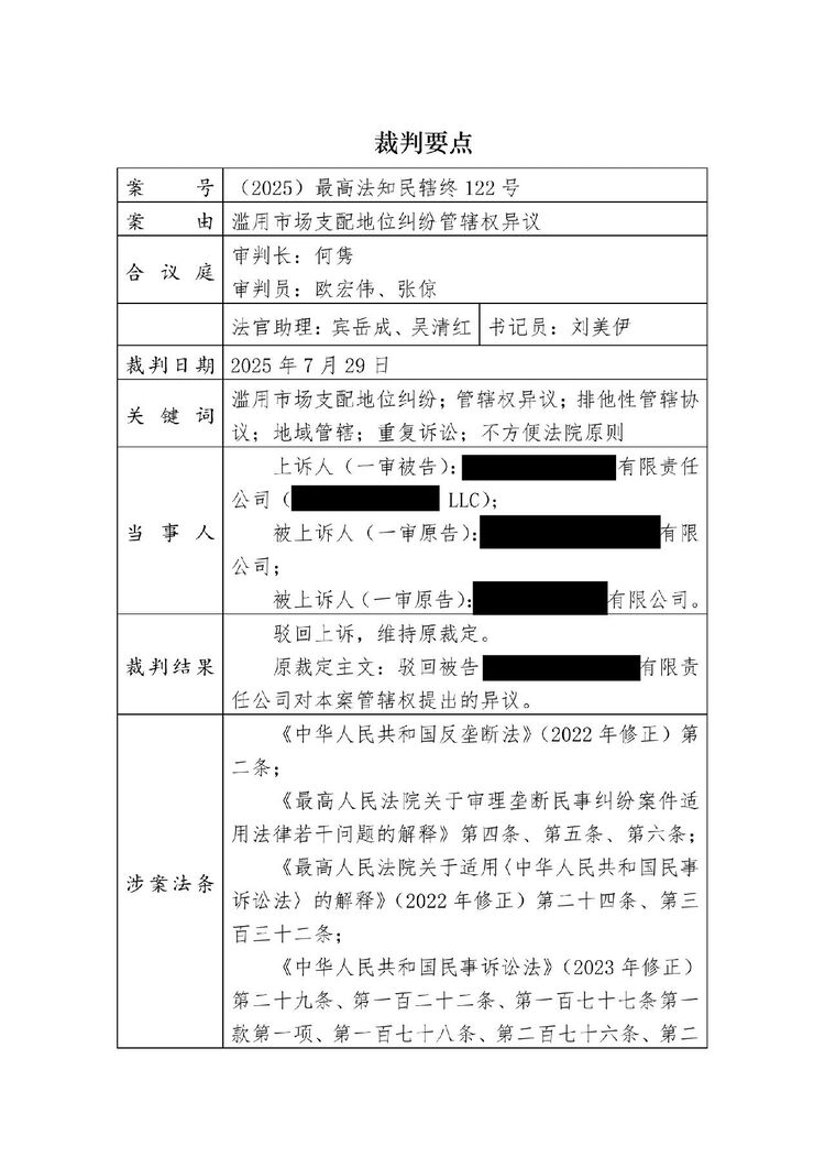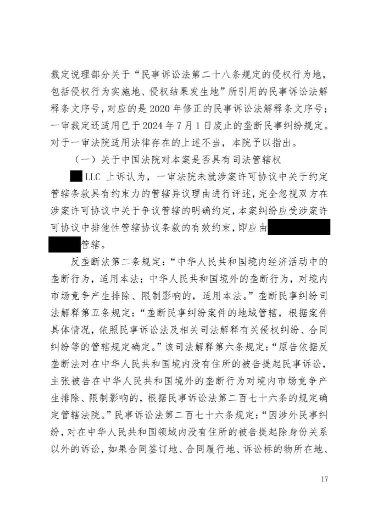 知产财经获悉,近日,最高人民法院就上诉人美国某有限责任公司(简称“美国LLC”)与被上诉方中国A公司、中国B公司滥用市场支配地位纠纷管辖权异议一案作出终审裁定:驳回上诉,维持原裁定,确认中国法院对本案具有管辖权。