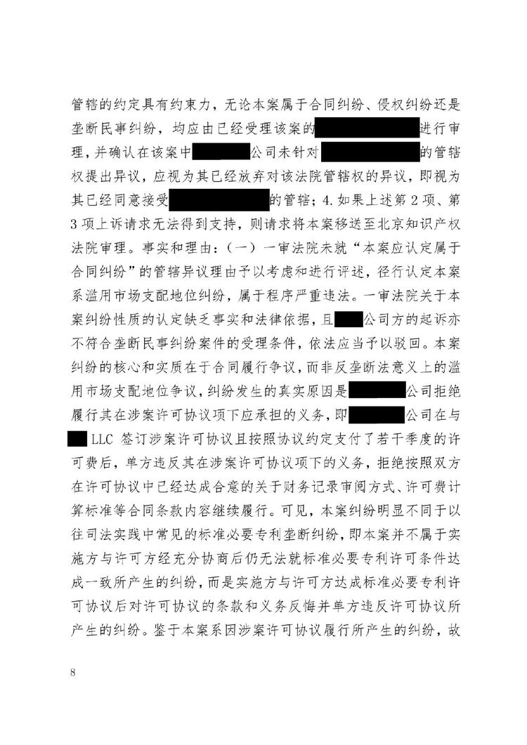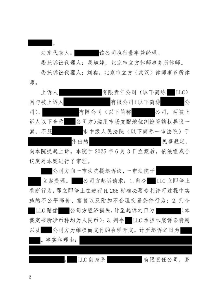 被上诉方主张,美国LLC在H.265标准必要专利许可市场中具有支配地位,但在许可过程中,美国LLC实施了不公平高价、搭售非标准必要专利、附加不合理交易条件等滥用市场支配地位的行为,严重排除、限制了被上诉方在中国相关市场的竞争,并造成其经济损失。据此,被上诉方向一审法院提起垄断民事侵权诉讼,要求美国LLC停止侵权、赔偿损失。