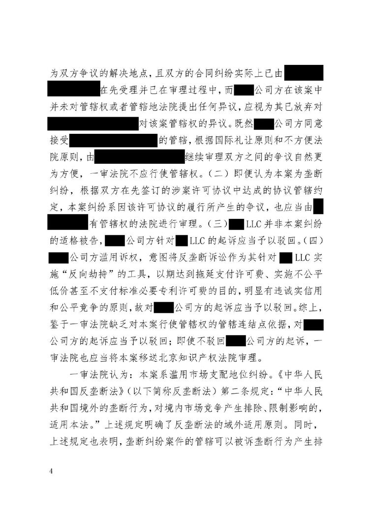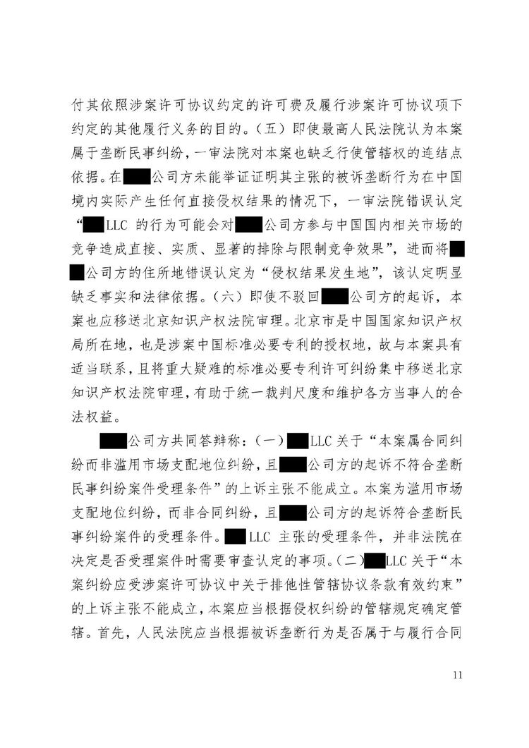美国LLC在提交答辩状期间对管辖权提出异议,核心理由是:本案实质是因履行双方《专利组合许可协议》产生的合同纠纷,而非垄断纠纷;该许可协议中已约定了争议解决管辖法院(某外国法院),且美国LLC已在该外国法院针对中国公司方提起了合同违约诉讼,两家中国公司未对管辖提出异议,应视为接受该外国法院管辖。因此,中国法院不应受理本案,或应驳回起诉,或将本案移送至北京知识产权法院审理。