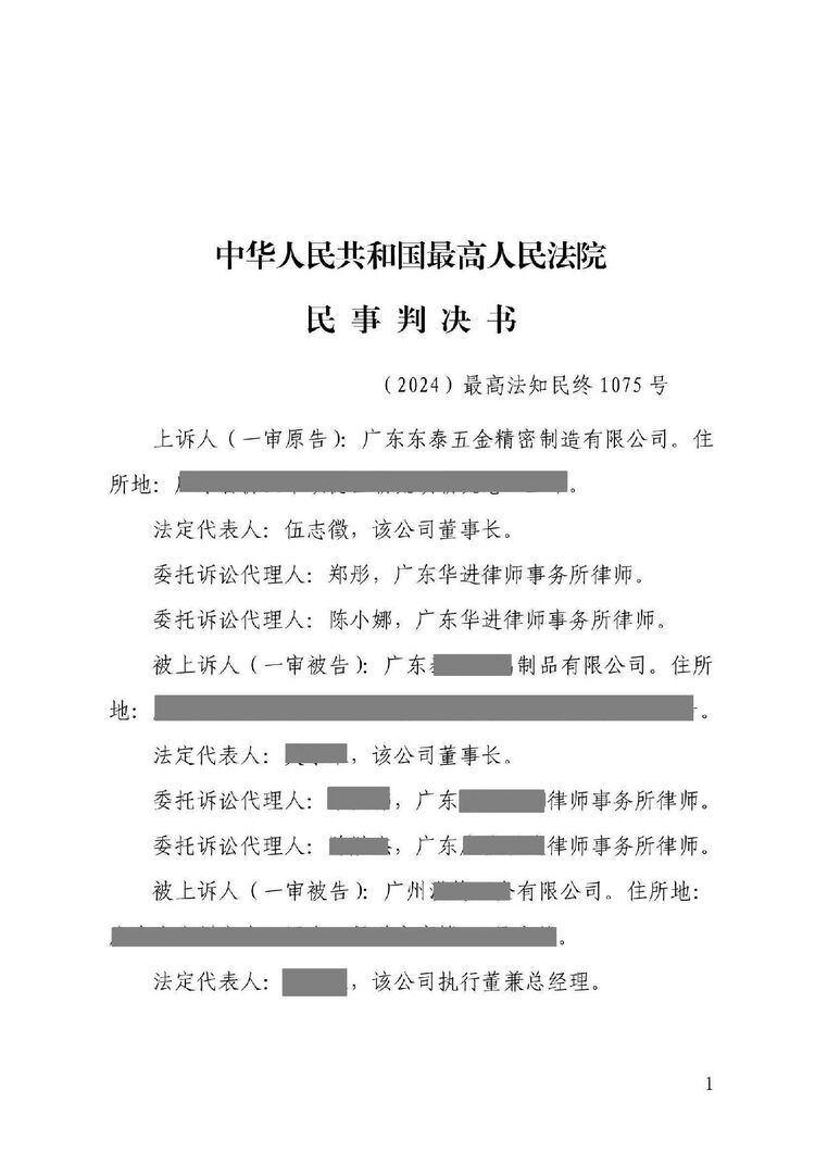 知产财经获悉,近日,最高人民法院(下称“最高法”)同时就广东东泰五金精密有限公司(下称“东泰公司”)与广东泰某金属制品有限公司(下称“泰某公司”)侵害发明专利权纠纷上诉【案号:(2024)最高法知民终1075号和1076号】两案作出终审判决,双双撤销一审判决,予以改判。其中,