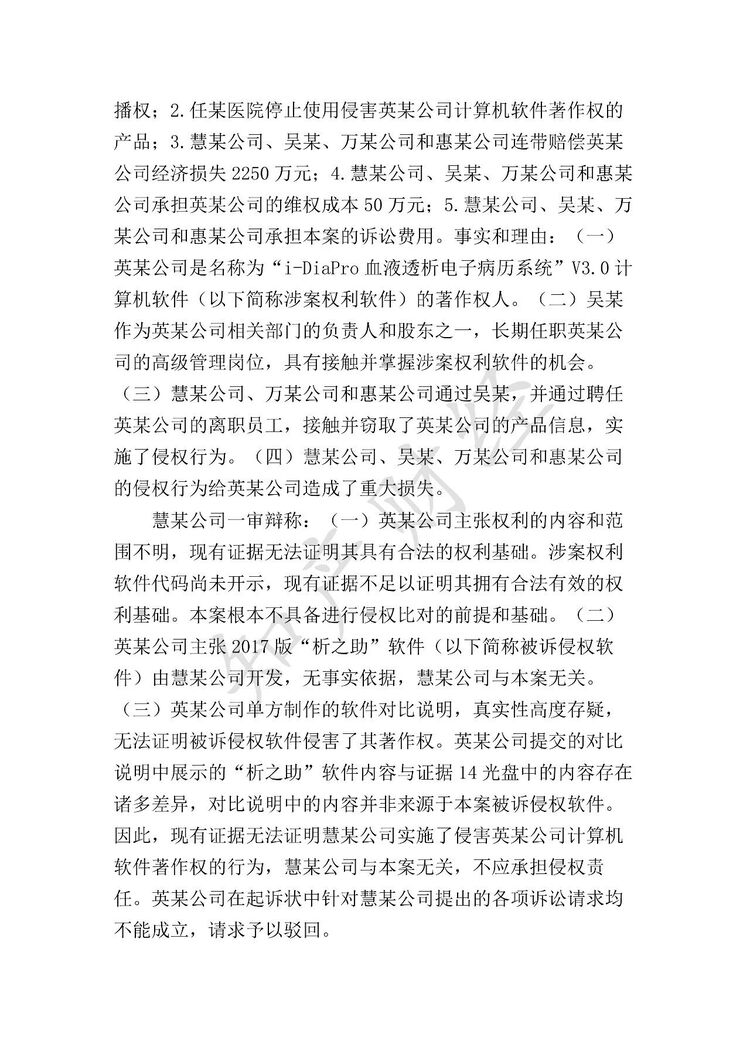 吴某、万某公司、惠某公司一审共同辩称:1. 吴某没有接触涉案权利软件源代码,英某公司提供的与SVN访问记录有关的证据不具有真实性;2. 被诉侵权软件为慧某公司独立开发完成,万某公司和惠某公司针对该软件具有合法来源,侵权行为与万某公司和惠某公司无关;3. 惠某公司系在万某公司与慧某公司的《服务合同》履行期间成立,惠某公司在此期间的软件销售收入为零;4. 惠某公司的代码服务器于2019年1月7日出现严重故障,在进行修复的重新初始化硬盘时,历史记录被覆盖。故万某公司和惠某公司无法提交被诉侵权软件源代码;5. 被诉侵权软件与涉案权利软件不构成实质性相似。从WebService的目标代码、数据库备份文件、软件运行界面和用户操作手册文档的比对结果看,两者均不构成实质性相似。被诉侵权软件中有24个数据库表与涉案权利软件存在相同或类似的表名或字段,但前述相同或类似的内容是血液透析管理软件必须使用的有限表达和功能性内容,不具有特征性。英某公司在其软件中设置了“导入汇某通”的功能菜单,并有多个模块直接采用和参考了汇某通软件的内容。综上,请求驳回英某公司的诉讼请求。