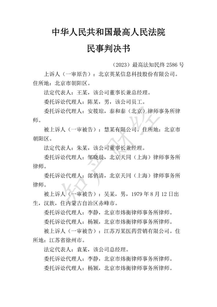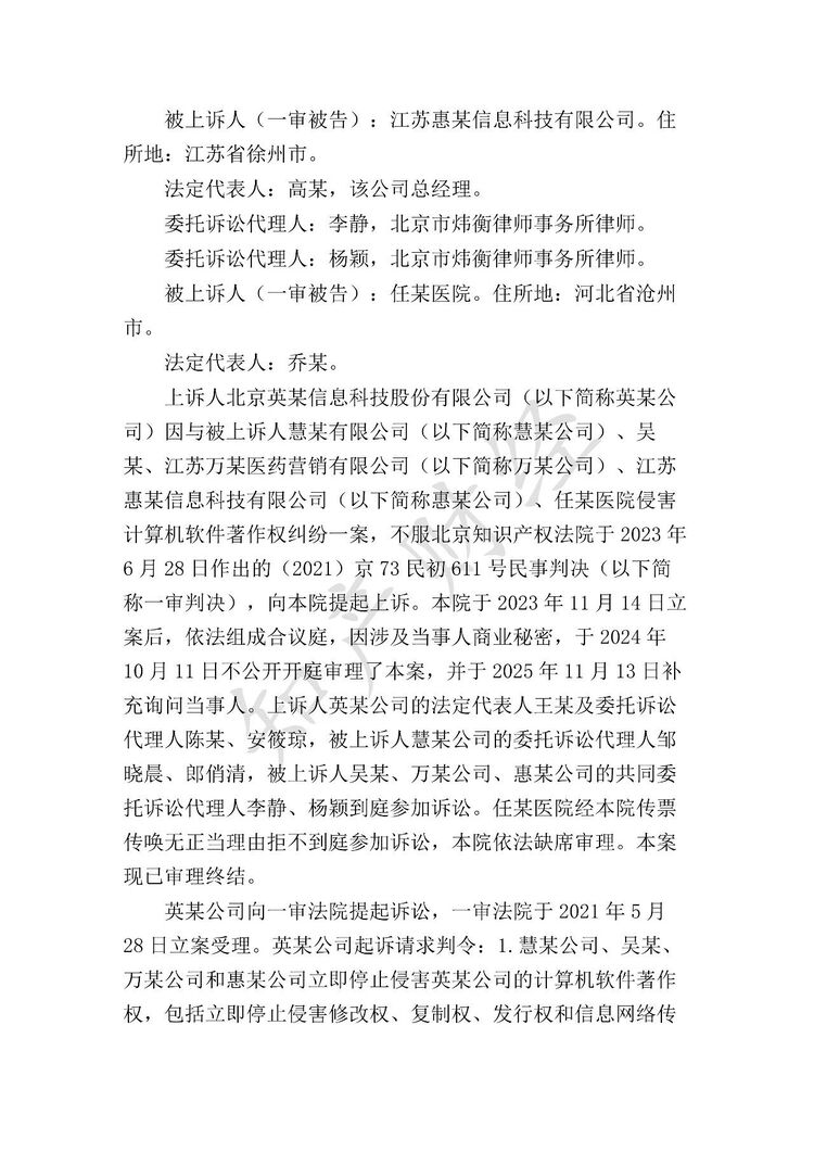 知产财经获悉,近日,最高人民法院就上诉人北京英某信息科技股份有限公司(以下简称“英某公司”)与被上诉人慧某有限公司(以下简称“惠某公司”)、吴某、江苏万某医药营销有限公司(以下简称“万某公司”)、任某医院等侵害计算机软件著作权纠纷一案作出二审判决。