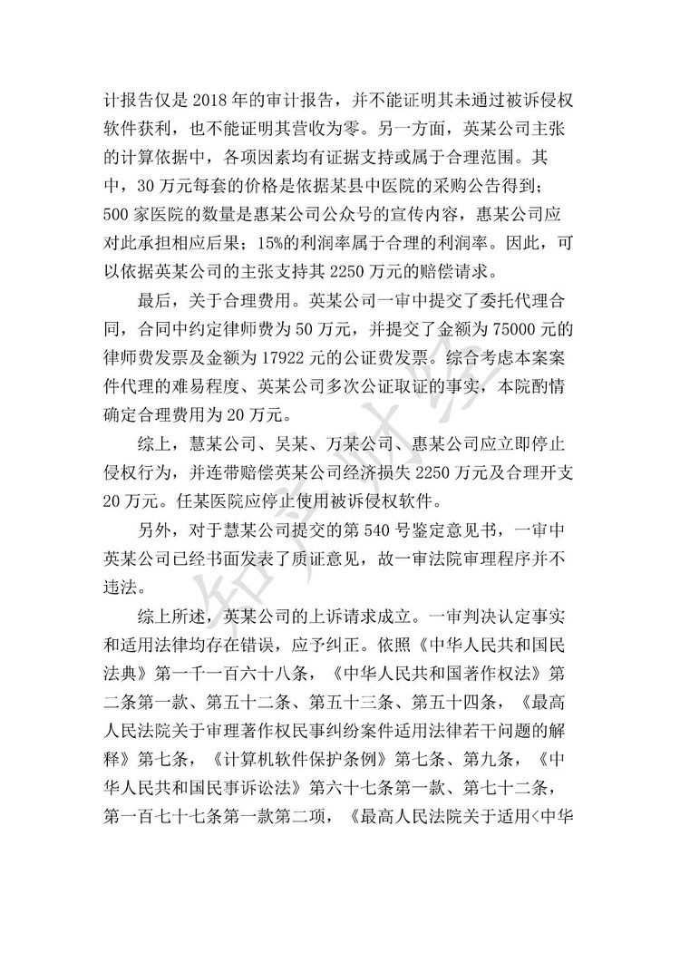法院认定,英某公司系“i-DiaPro 血液透析电子病历系统” V3.0 计算机软件的著作权人,有权提起本案诉讼;慧某公司、吴某、万某公司、惠某公司对侵权行为均属明知,构成共同侵权,任某医院应停止使用被诉侵权软件;一审法院适用 2017 年修正的《中华人民共和国民事诉讼法》及举证责任分配存在不当,故撤销一审判决,判令四侵权方立即停止侵权行为,连带赔偿英某公司经济损失 2250 万元及合理维权开支 20 万元。