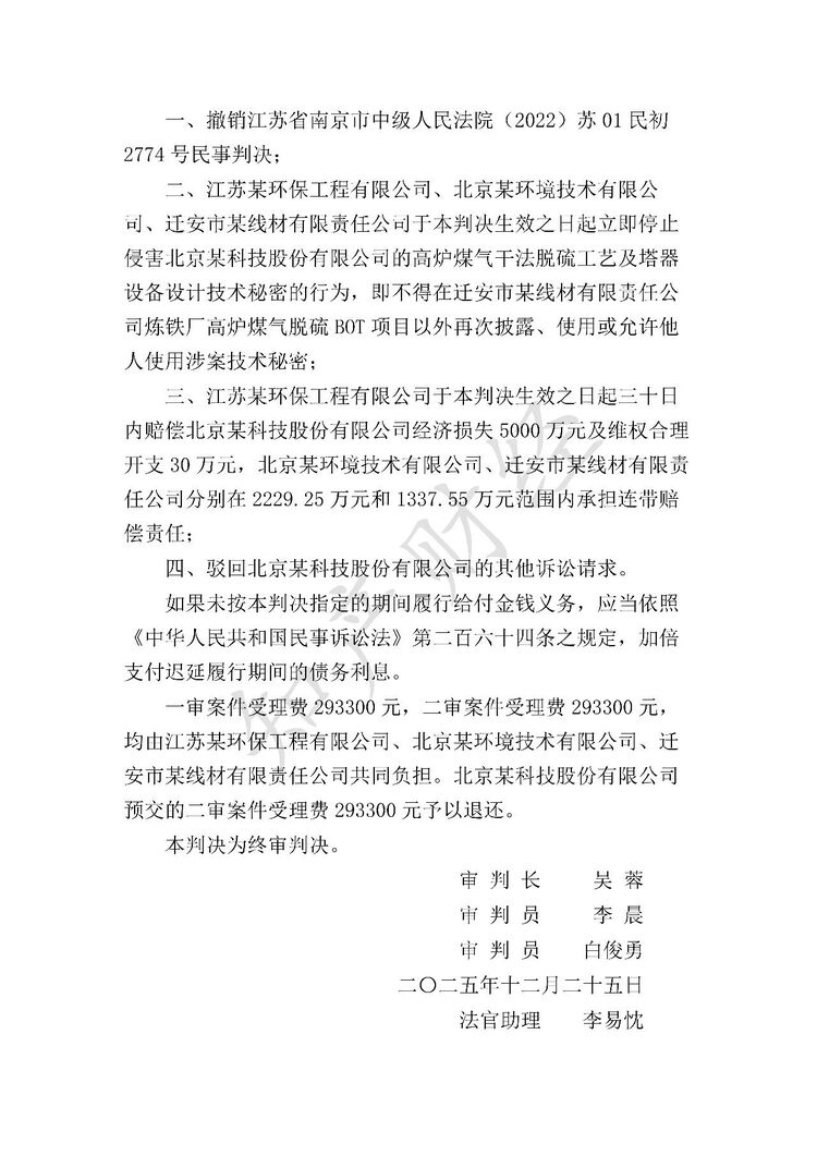 知产财经获悉,近日,最高人民法院就上诉人北京某科技股份有限公司与被上诉人江苏某环保工程有限公司的侵害商业秘密纠纷一案作出二审判决:北京某科技股份有限公司所主张的高炉煤气干法净化工艺及设备设计技术信息作为整体构成商业秘密,江苏某环保工程有限公司在参与相关项目过程中接触并违反保密约定,在后续BOT项目中未经许可使用该技术,构成侵权;同时,其他共同承包方因参与项目实施并获利,亦构成共同侵权;法院据此撤销一审判决,改判各被告停止侵权,并适用惩罚性赔偿,连带赔偿经济损失5000万元及合理维权费用30万元。