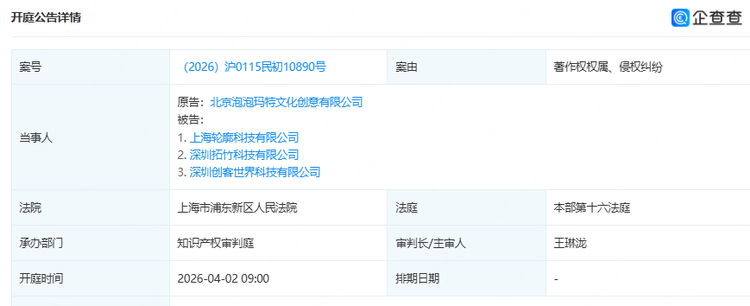 据案件详情,原告为泡泡玛特,被告包括拓竹科技、深圳创客世界科技有限公司、上海轮廓科技有限公司,该案将于4月2日开庭。