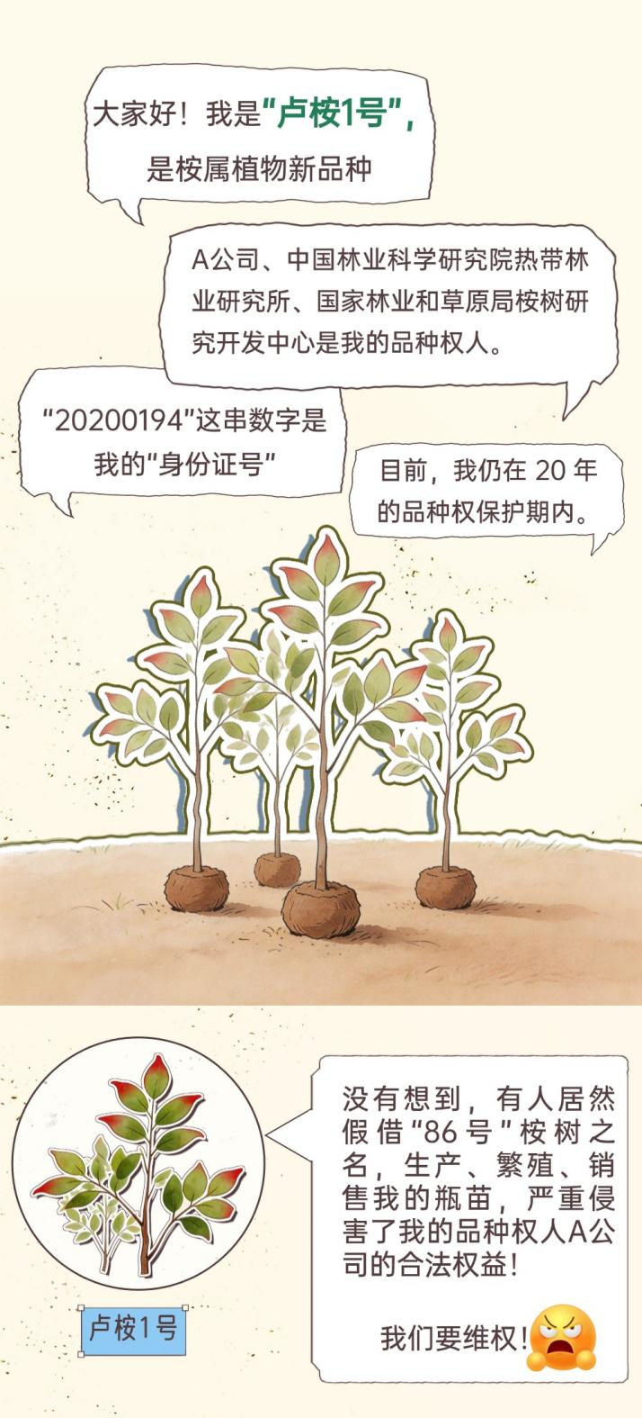 广州知识产权法院审理认为,A公司作为植物新品种“卢桉1号”的品种权共有人,依法享有植物新品种权。经检测,被诉侵权植株“86号”桉树瓶苗是整株桉树植物,属于繁殖材料,与涉案授权品种“卢桉1号”具有同一性。