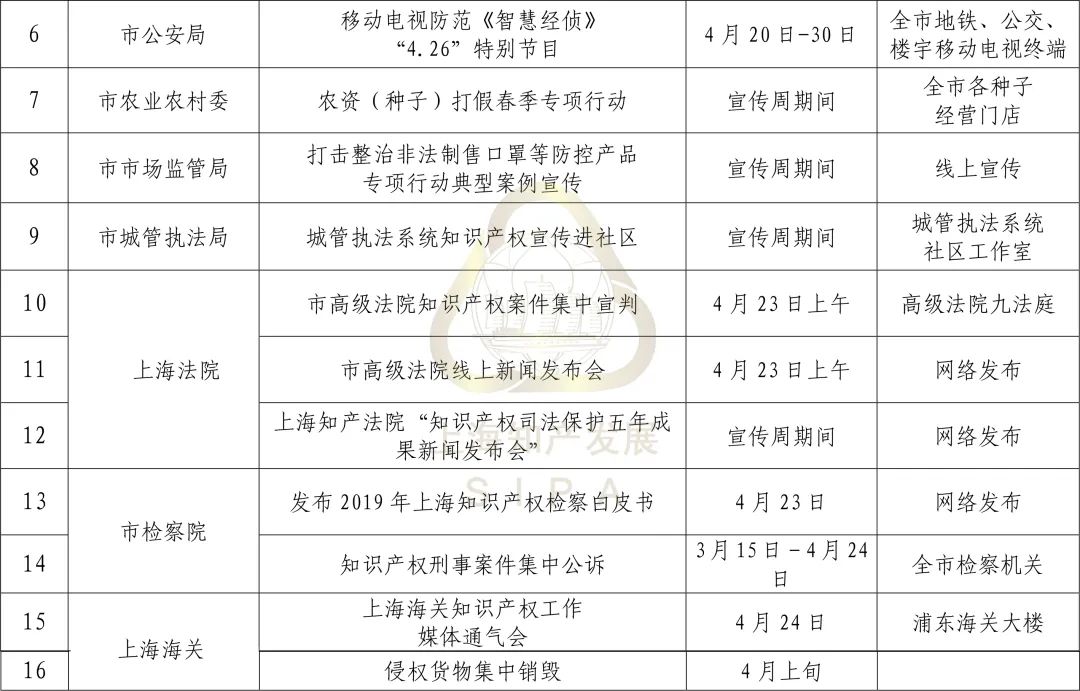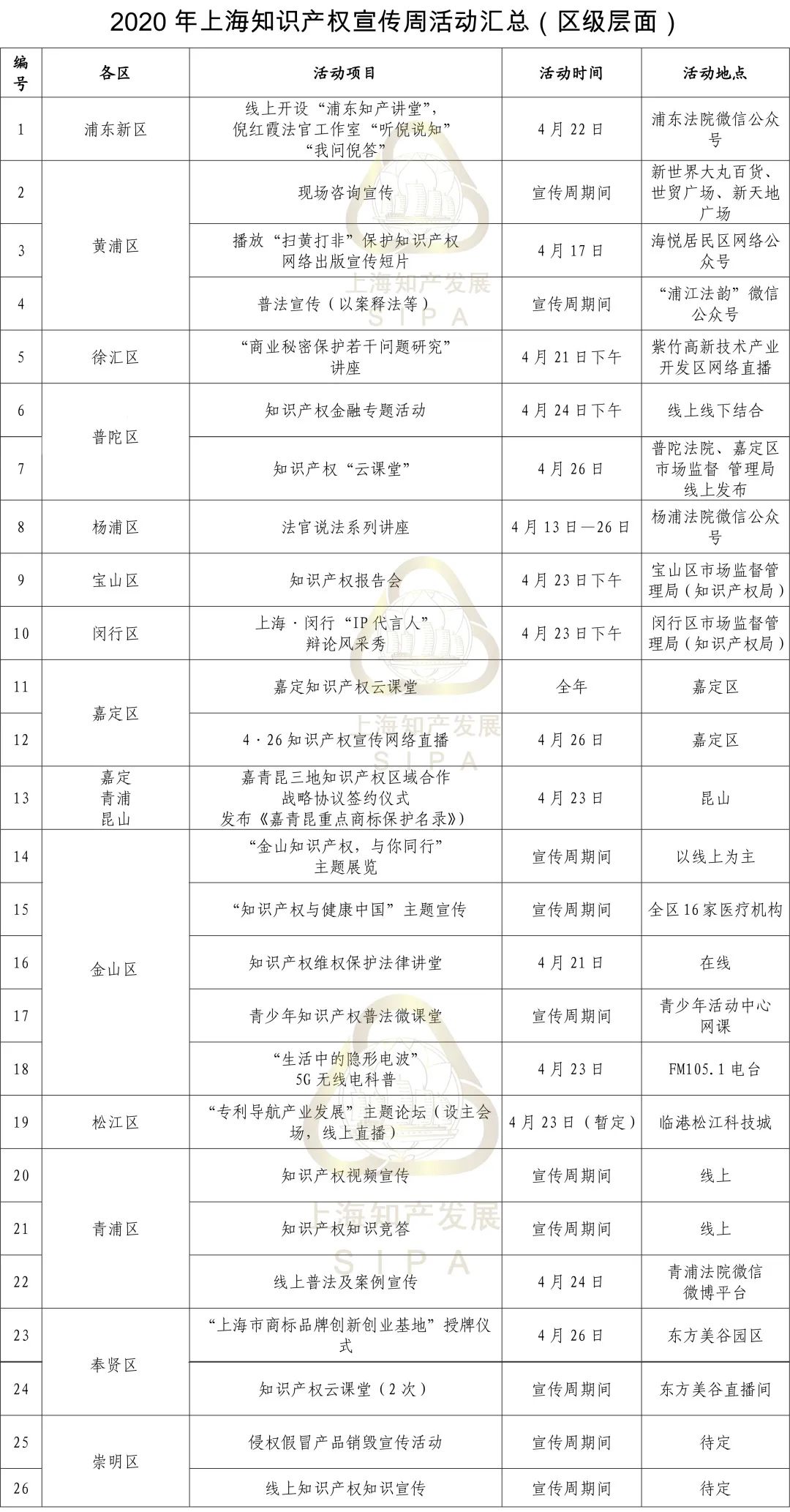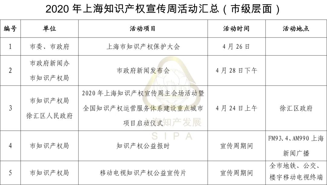 为庆祝第20个世界知识产权日,根据全国知识产权宣传周活动组委会的通知要求,上海组织开展以“知识产权与健康中国”为主题的2020年上海知识产权宣传周活动。