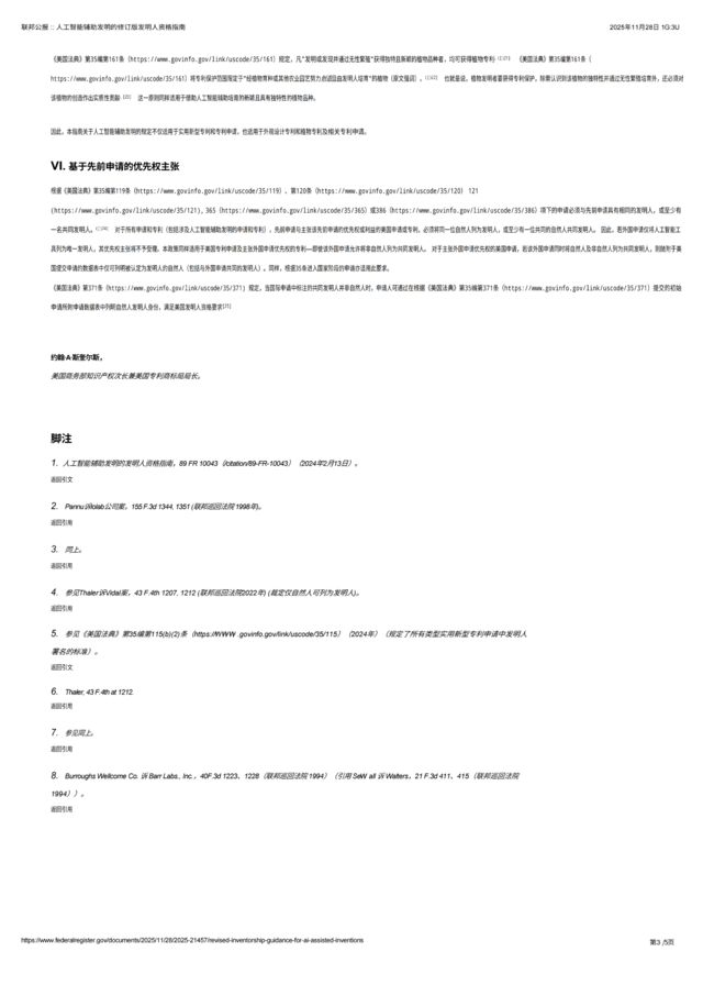 此次新指南的发布,亦意味着美国专利商标局前任局长凯西?维达尔(Kathi Vidal)于2024年提出的更为严格的AI辅助发明人资格标准被全面废止——该标准要求自然人需对每一项专利权利要求均作出“重大贡献”。
