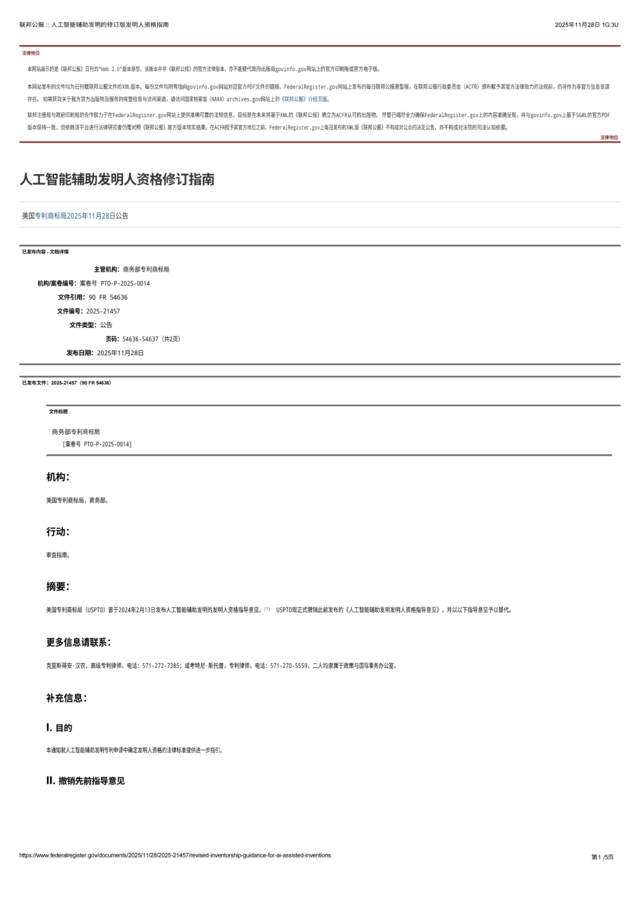 知产财经从Reuters获悉,2025年11月26日,美国专利商标局(USPTO)发布最新指南,明确规定:即便发明过程中运用了生成式人工智能(AI)系统,AI仅应被认定为辅助工具(类同实验室设备、软件、数据库等),不得被列为发明人;合法发明人仅限于对发明构思作出实质性贡献的主体,即自然人。
