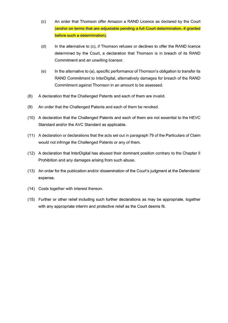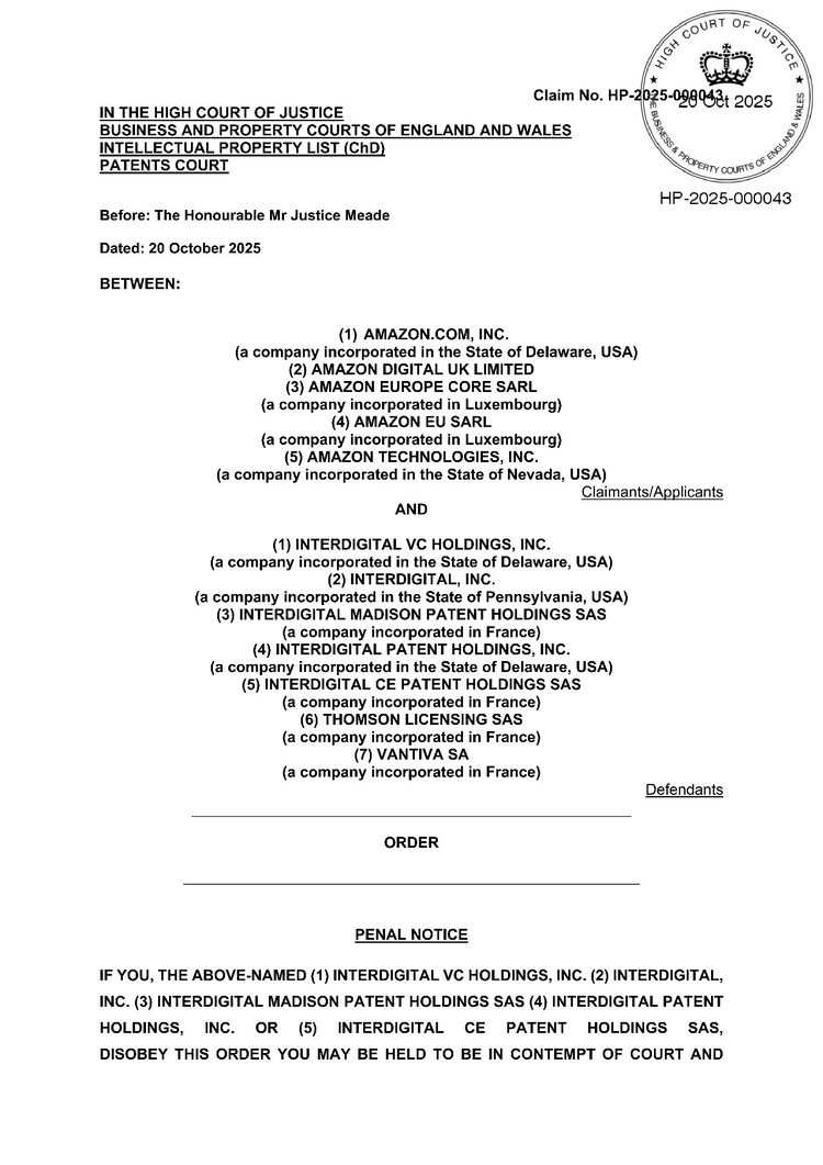 本案源于亚马逊与InterDigital之间关于HEVC(高效视频编码)标准必要专利的许可纠纷。亚马逊于2025年8月29日在英国法院提起诉讼,核心目的是寻求一项针对InterDigital相关专利的全球FRAND许可。其诉求主要包括:宣告亚马逊是InterDigital FRAND承诺的受益人;宣告InterDigital有义务按FRAND条款许可其视频编码标准必要专利;请求法院裁定FRAND许可的具体条款(包括费率);请求法院宣告InterDigital相关专利无效或不可执行。