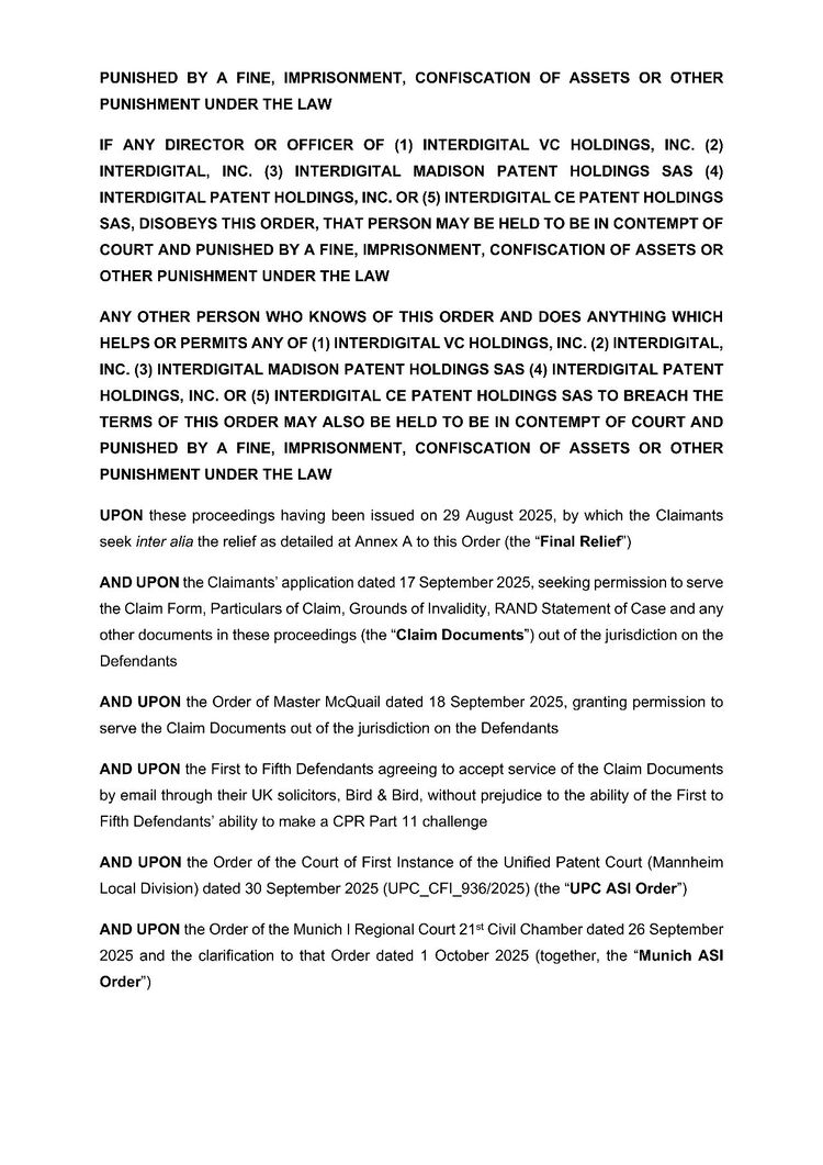 知产财经获悉,2025年10月20日,英格兰及威尔士高等法院的法官Meade对InterDigital在内的五家关联公司(下称“InterDigital”)发出了一项临时的“反禁诉令(AASI)”。