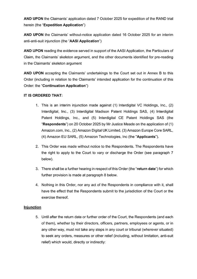 该命令是在未经InterDigital方面聆讯的单方申请下作出的,旨在阻止InterDigital通过在其他国家法院寻求禁诉令等救济措施,来干扰或阻止亚马逊在英国法院正在进行的一系列关键诉讼程序。