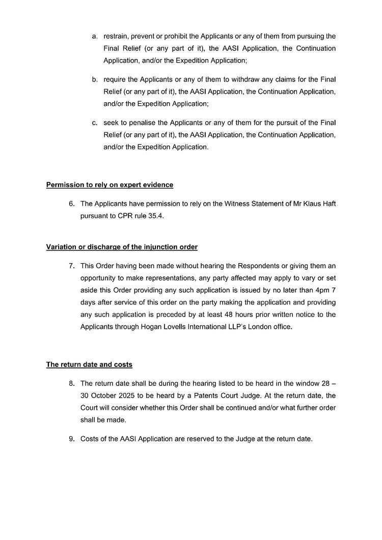 为保障英国诉讼程序不受干扰,Meade法官作出裁定,即在进一步的听证会之前,InterDigital不得在任何法院或仲裁庭采取以下行动: