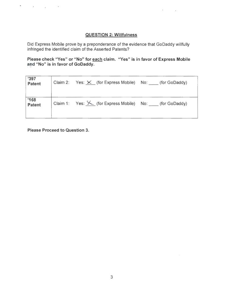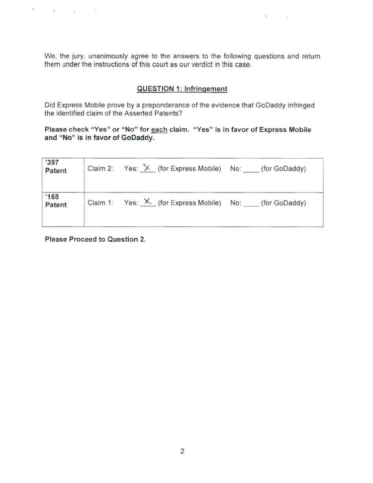 经审理,陪审团认为,GoDaddy确实侵犯了Express Mobile两项专利('397专利第2项权利要求和'168专利第1项权利要求),且该侵权行为属于故意侵权;同时,GoDaddy未能提供有力证据证明涉案专利无效。因此,陪审团裁定GoDaddy需就其持续的侵权行为向Express Mobile支付总计1.7亿美元的赔偿,其中7000万美元是针对2019年12月2日至2022年12月6日期间的专利许可费。