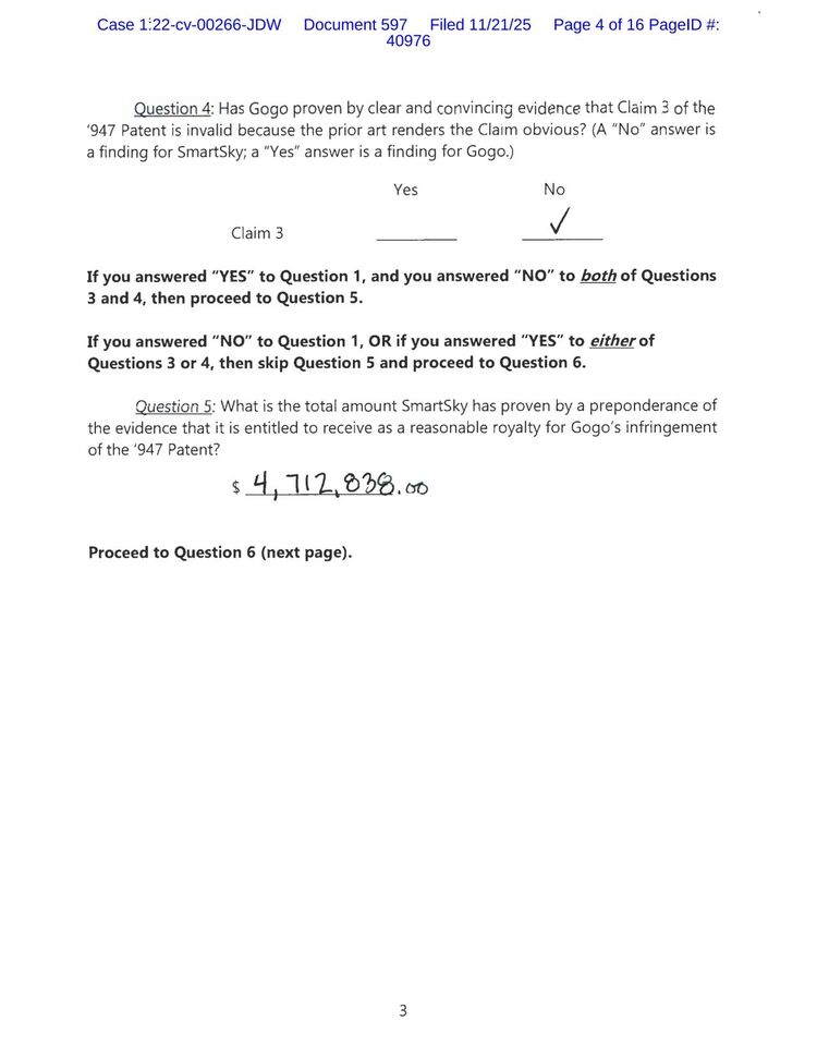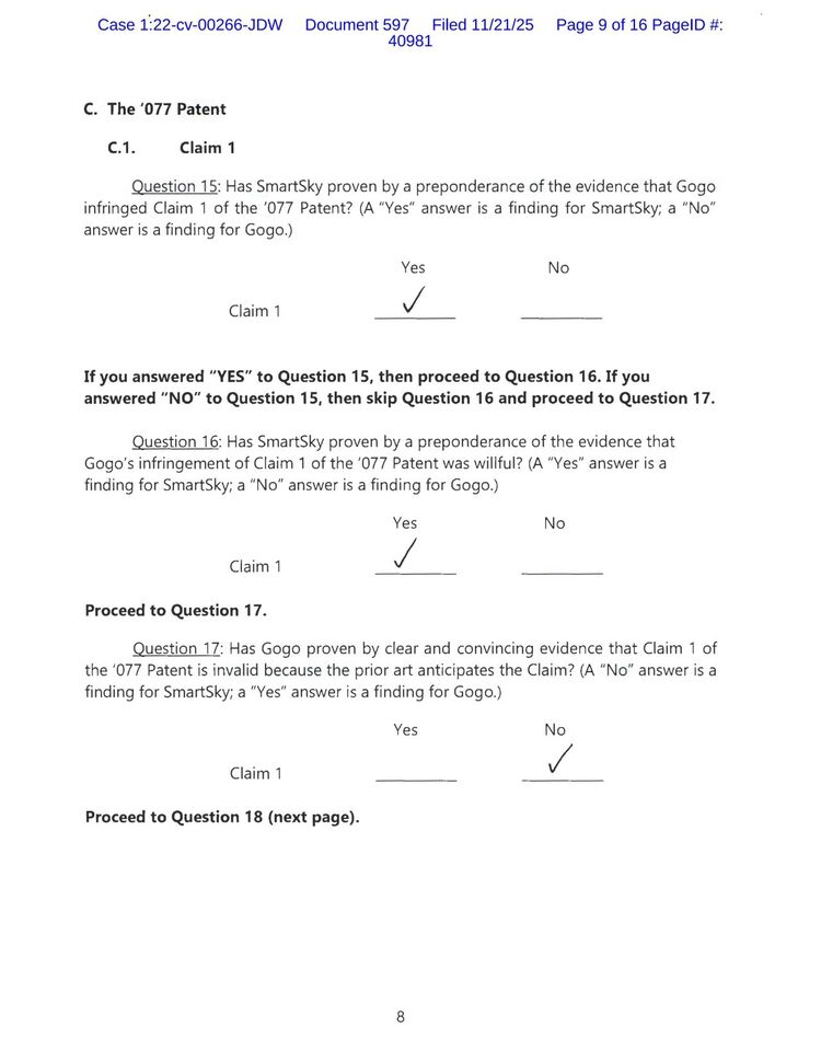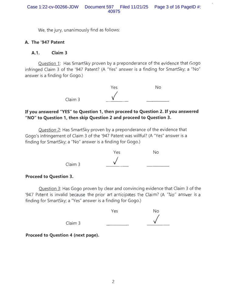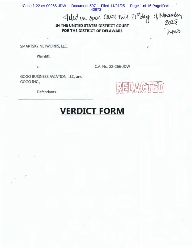 此专利纠纷最早由SmartSky于2022年提起,核心争议在于Gogo推出的5G ATG网络是否侵犯了SmartSky的专利技术。被认定侵权的专利涉及SmartSky的多项关键技术,包括地面发射/接收系统(ground-based transmissions)及其在机上Wi?Fi服务中的应用。2024年初,法院曾拒绝SmartSky对Gogo的临时禁令申请,因此Gogo得以继续部署其网络服务。陪审团最终裁定Gogo的行为构成故意侵权,并判赔2270万美元。