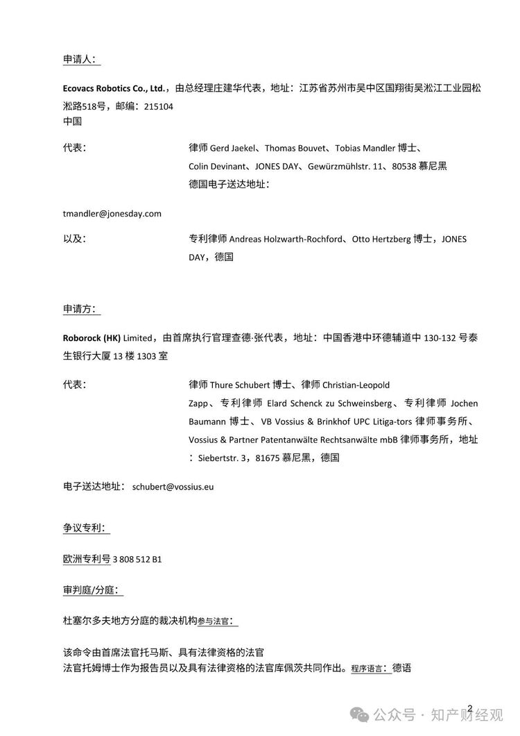 2025年9月3日,科沃斯在欧洲统一专利法院(UPC)杜塞尔多夫地方分院起诉石头科技,指控其在欧洲市场侵犯专利 EP3808512B1(案号:ACT_36001/2025);