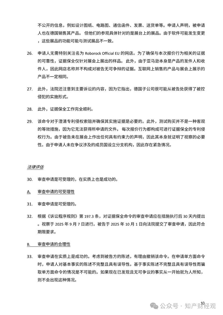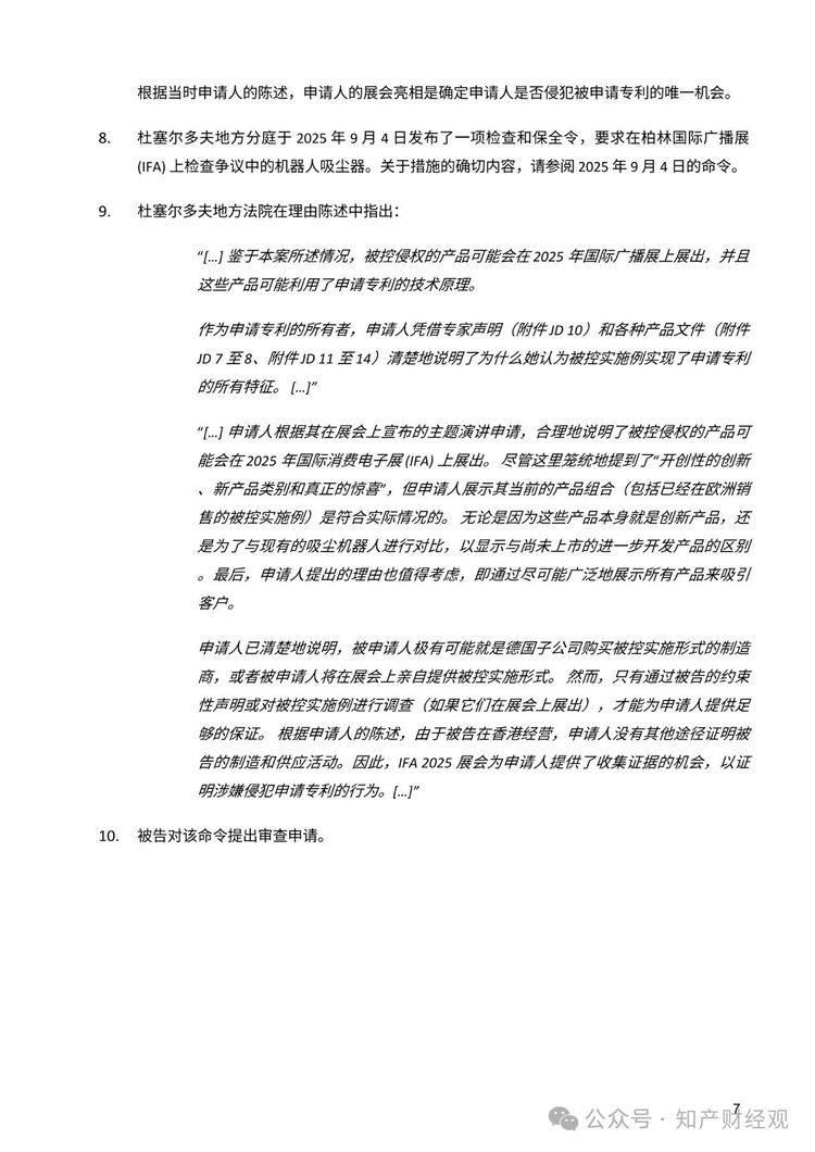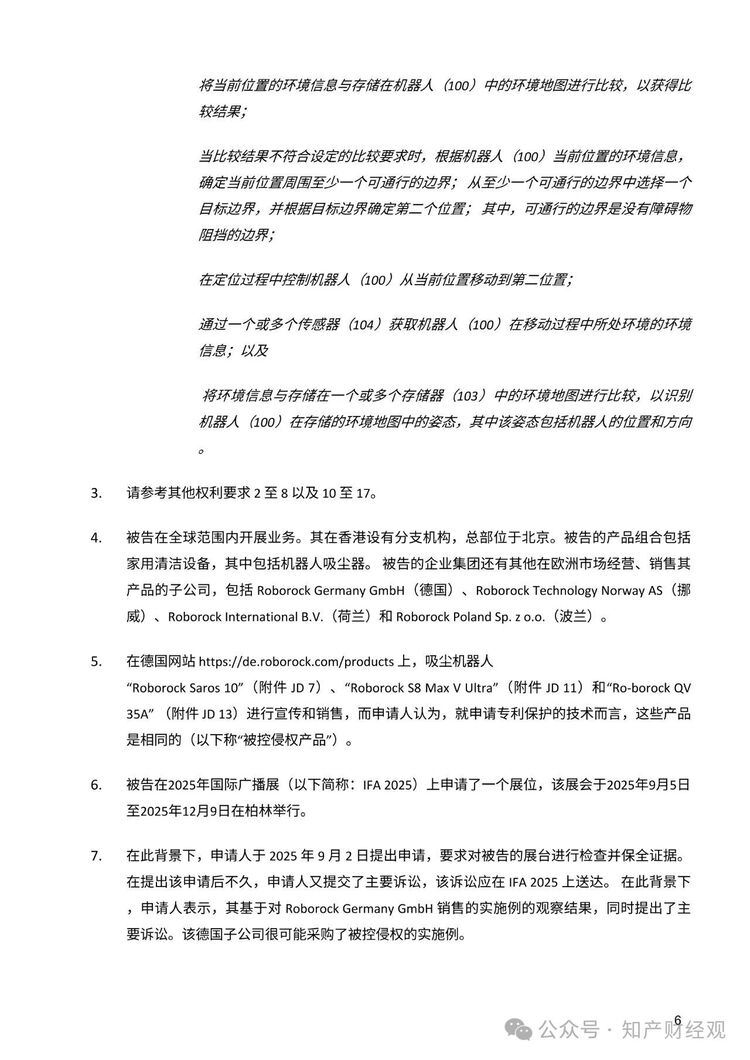 2025年9月4日,UPC杜塞尔多夫地方分院基于科沃斯的单方申请,作出证据保全及现场检查命令(案号:UPC_CFI_834/2025);