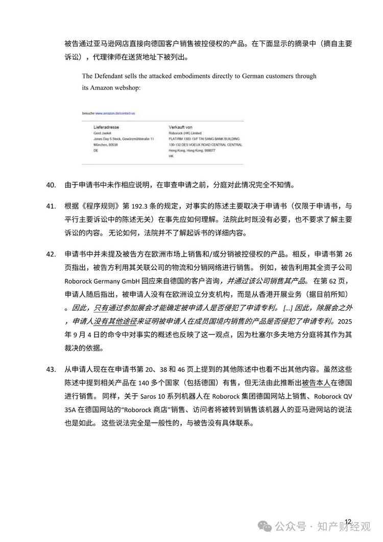 2025年10月7日,石头科技在德国慕尼黑第一地区法院申请临时禁令获支持,禁止科沃斯在德国销售 DEEBOT N20 PLUS/PRO PLUS,涉及专利 EP3231340(案号:21 O 12347/25);
