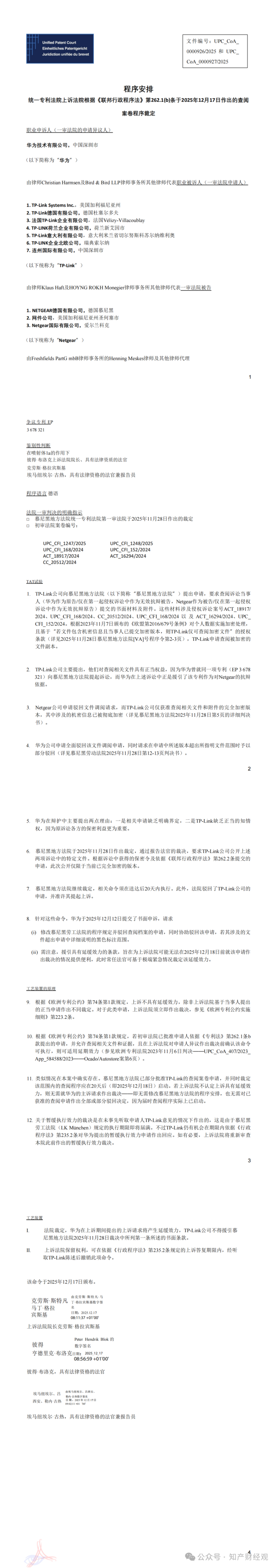 本案围绕华为持有的欧洲专利EP 3 678 321展开。此前,华为就该专利向Netgear 提起专利侵权诉讼。TP-Link因同样被华为就该专利起诉,向法院申请查阅华为与Netgear案件中的部分诉讼文件,主张其对相关材料具有合法知情利益。