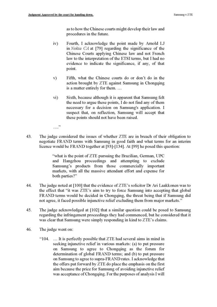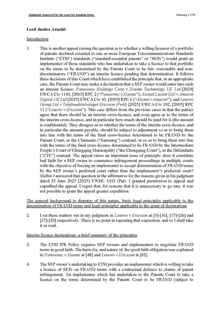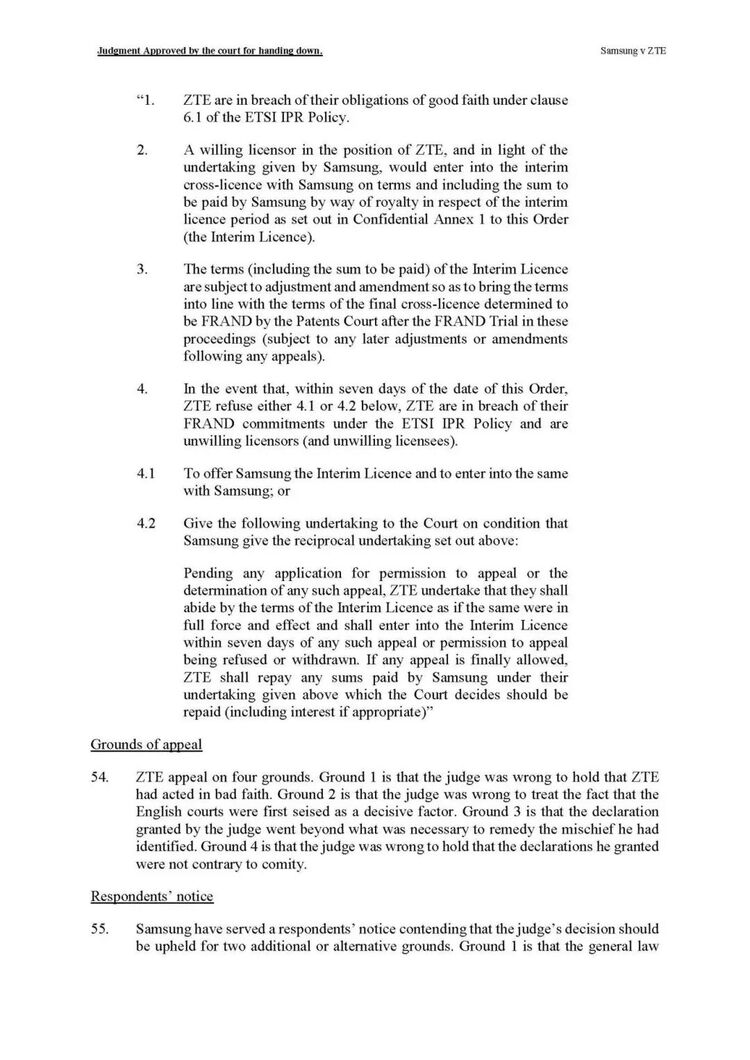 高等法院法官Mellor此前裁定,中兴通过在多国提起禁令诉讼,意图迫使三星接受重庆法院作为FRAND裁决地,构成“恶意”行为,并批准了三星提出的临时许可声明。
