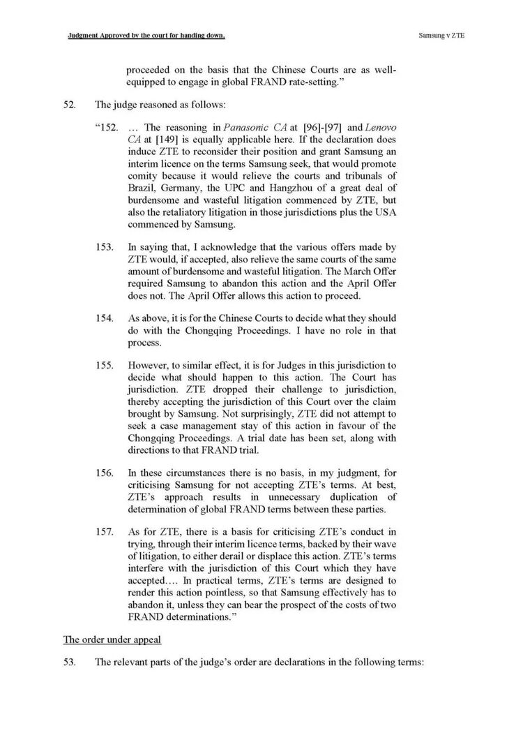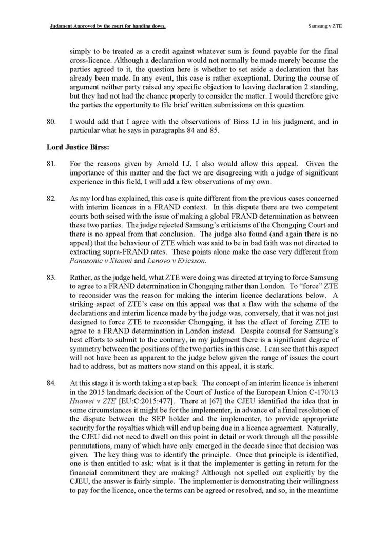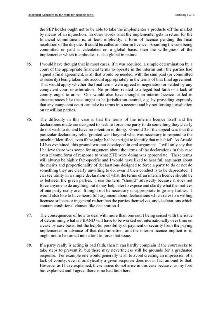 由三位上诉法官组成的合议庭一致推翻了这一判决。主审法官Arnold 在判决书中指出:“除非对某一法院存在合法且有证据支持的反对理由,否则SEP持有人试图迫使实施者接受其偏好的法院来确定FRAND条款,并不构成恶意。”