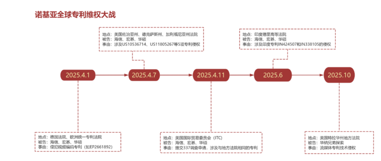 海信此次主动对诺基亚提起专利侵权诉讼,并非孤立事件 —— 在此之前,诺基亚已在 2025 年针对包括海信在内的多家企业(含宏碁、华硕)发起多轮专利诉讼,诉讼范围覆盖美国、印度、欧洲等多个国家和地区的司法及行政机构。