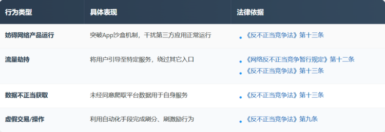 传统的“妨碍”认定多针对直接的破坏、干扰或恶意不兼容行为。而豆包手机助手的操作,披上了“用户授权”和“提升效率”的外衣,其性质更为复杂。这要求司法实践和监管思路必须更新:判断标准应从“是否造成物理性或显性干扰”,转向“是否实质性破坏了目标软件预设的运行逻辑、数据安全边界及商业模式”。