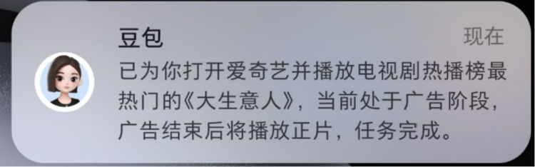 举例来说,输入“豆包豆包,帮我打开爱奇艺播放最热门的电视剧”,手机将自动在后台进行相应操作;操作完成后,手机直接从桌面弹出爱奇艺App,进行播放电视剧内容的操作,并播放片头广告(无会员账号)。豆包通过弹窗方式告知“当前处于广告阶段,广告结束后播放正片”。