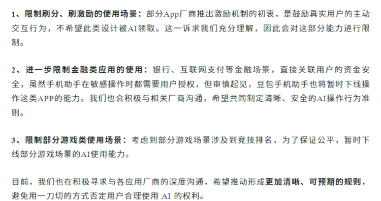 面对这一系列挑战,豆包手机助手团队于12月5日发布公告,宣布对AI操作手机能力进行规范化调整。