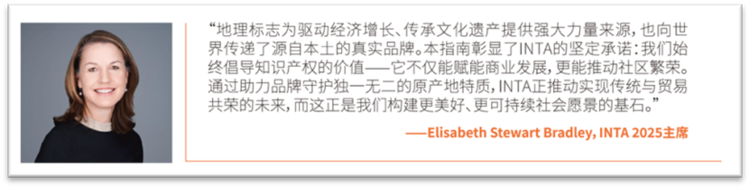 本指南由INTA地理标志委员会成员撰写并提供索引,并由INTA中国会员翻译并校对,内容兼具战略性与实操性,并将成为中国地理标志用户不可或缺的参考工具,助力中国企业将独特的地理标志转化为受全球市场认可的品牌资产,增强其国际影响力和核心竞争力。