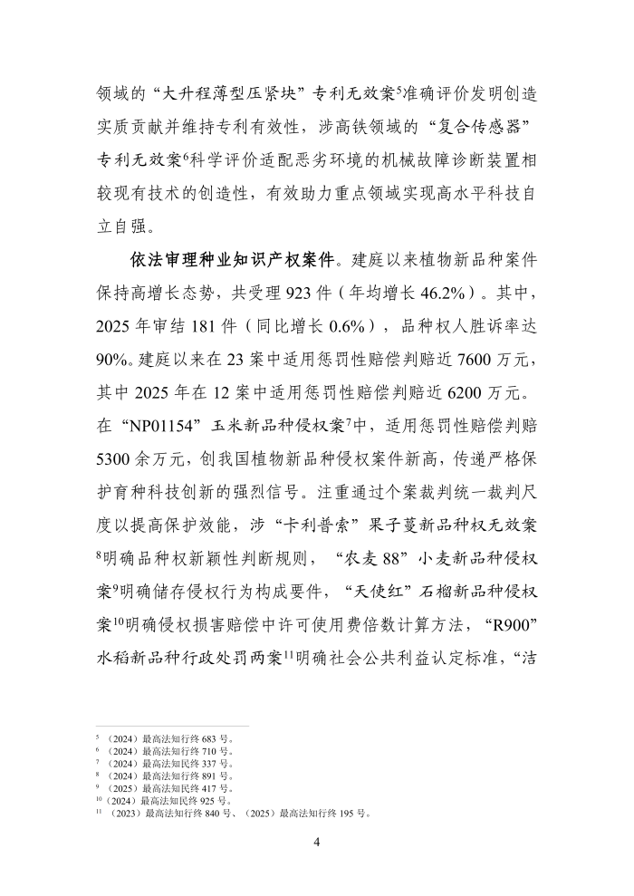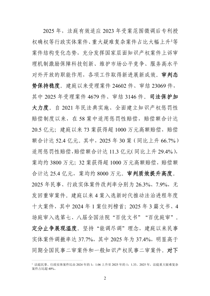 2025年是“十四五”规划收官之年,也是最高人民法院知识产权法庭改革试点的第七年。在最高人民法院党组的坚强领导下,法庭坚持以习近平新时代中国特色社会主义思想为指导,深入学习贯彻习近平法治思想,全面贯彻党的二十大和二十届历次全会精神,认真落实《中共中央关于加强新时代审判工作的意见》,积极发挥国家层面知识产权案件上诉审理机制作用,不断提升审判质效,以加强司法保护知识产权保障创新驱动发展战略实施,以强化司法反垄断服务构建全国统一大市场,为加快发展新质生产力提供有力的知识产权与公平竟争法治保障。现发布法庭2025年工作年度报告,以期增进社会各界对法庭工作的了解和监督。