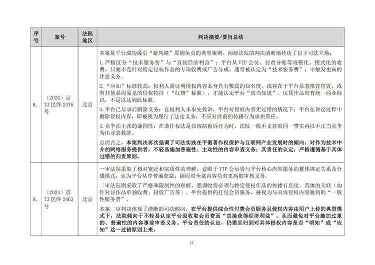 (2025)京0491民初7749号判决[8]提及了“避风港”原则的适用,强调平台责任应以其存在过错为前提,而不应为其施加普遍的内容审查义务。同样在(2024)京73民终2476号案件[9]里面,再次明确不要轻易地施加普遍性、主动性的内容审查义务,平台责任的认定需严格遵循基于具体过错的归责原则。(2024)京73民终2463号[10]二审判决体现了一个非常清晰的司法倾向:在平台提供综合性付费会员服务,且侵权内容由用户上传的典型的模式下,法院倾向于不轻易认定平台因收取会员费而“直接获得经济利益”,从而避免对平台施加过重的、普遍性的内容事前审查义务。平台责任的认定,仍需回归到对具体侵权内容是否“明知”或“应知”这一过错原则上来。(2024)京73民终2018号[11]判决中也有类似表述,强调侵权责任的认定必须基于平台存在具体、可归责的过错。