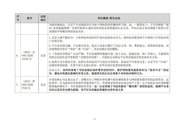 在(2025)京0491民初11529号判决[7]中,北京法院全面阐述了网络服务提供者责任认定的基本框架。判决明确:上传侵权内容的用户是直接侵权责任人,提供技术服务的平台原则上不直接对用户内容负责;平台能否免责,取决于其是否履行了法定义务,即事前提示、设置投诉渠道、对具体侵权内容不明知或应知,并在知晓后及时删除;直接经济利益认定严格,平台的通用性激励计划和广告收入不被视为从特定侵权作品中获取的直接经济利益;权利人负有投诉义务,这是启动平台处理义务、认定平台应知过错的重要前提。总而言之,该判决体现了司法实践在保护著作权的同时,维护网络服务提供者作为技术中介的定位,避免对其施加普遍性审查义务,强调责任的认定必须基于具体的过错和行为。