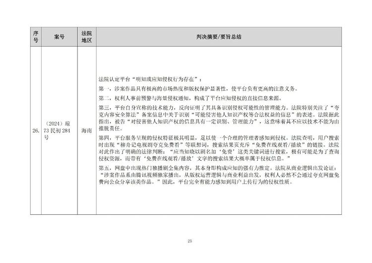 在(2024)琼73民初284号[27]判决中,海南法院对平台应知的认定提出了五个重要考量因素:(1)涉案作品具有极高的市场热度和版权保护显著性;(2)权利人的事前预警与海量侵权通知;(3)平台自身宣称的技术能力;(4)平台服务呈现的侵权特征极其明显;(5)网盘中出现热门独播剧全集内容,其本身即构成“应知”的强有力推定。