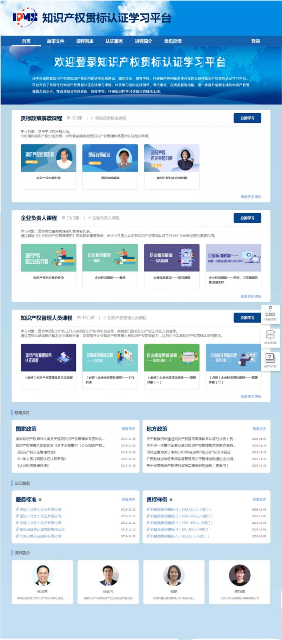 学习平台是贯彻落实党中央、国务院关于深化“放管服”改革、转变政府职能要求,由我局组织建设的全国性知识产权贯标认证工作综合服务载体,旨在满足各类创新主体开展知识产权贯标认证工作日益增长的学习需求,提供精准化的学习方式。