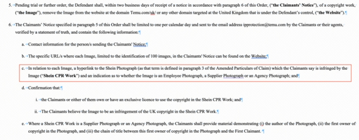 据了解,英国法院此次针对Temu颁发的临时禁令,是对其于2023年9月首次颁布的临时禁令的更新版本。当时,SHEIN关联公司在英国对Temu提起诉讼,指控Temu平台上存在上千张侵权图片,并要求法院对Temu颁发临时强制令(interim mandatory injunction),指令Temu根据SHEIN的投诉通知下架相关侵权图片。今年2月,由于双方对于原先禁令的解释存在分歧且Temu申请修改禁令,在新一轮听证程序后,英国法院颁布了新的临时禁令,继续禁止Temu对SHEIN的相关侵权行为。法院明确,该禁令适用于SHEIN拥有版权的所有图片,包括其自主拍摄的、供应商或者外部摄影机构拍摄的图片。禁令要求Temu在收到投诉函后的2个工作日内采取措施,停止使用侵权图片,否则将可能因藐视法庭而受到处罚。