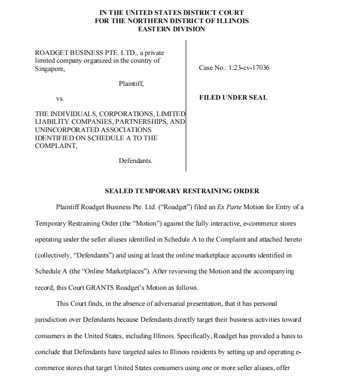 伊利诺伊州联邦地区法院针对包括Temu商户在内的涉事方发布的TRO裁定之一