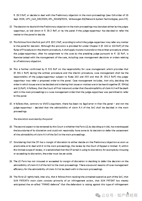 对此,UPC上诉法院明确指出,根据《程序规则》第102条及第331条,承办法官有权将相关事项提交合议庭决定,合议庭亦可作出案件管理性裁定,包括决定不同争点的审理顺序。因此,由合议庭决定将初步异议并入实体审理,并不存在程序违法。