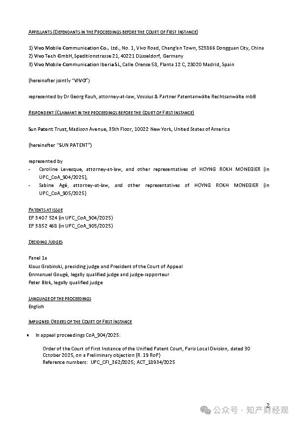 知产财经获悉,2026年3月16日,欧洲统一专利法院(UPC)上诉法院就Vivo Mobile Communication Co., Ltd.等与Sun Patent Trust之间的标准必要专利(SEP)纠纷作出裁定,驳回Vivo方面提出的两项上诉请求,维持一审巴黎地方分庭此前关于初步异议的决定。