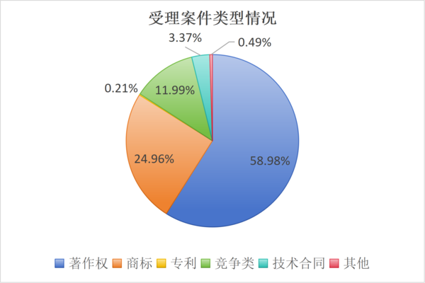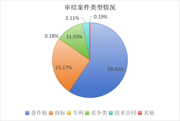 其中,审结著作权案件8020件、占比59.42%,商标案件3397件、占比25.17%,专利案件25件、占比0.18%,竞争类案件1611件、占比11.93%,技术合同案件419件、占比3.11%,其他知识产权民事纠纷案件25件、占比0.19%。