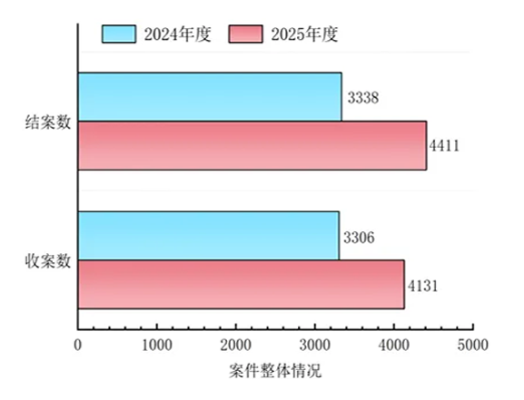 2025年度全市法院新收各类知识产权案件4131件,同比增长24.95%;审结4411件(含旧存),同比增长32.15%,一审服判息诉率达95.45%,审判质效稳步提升。