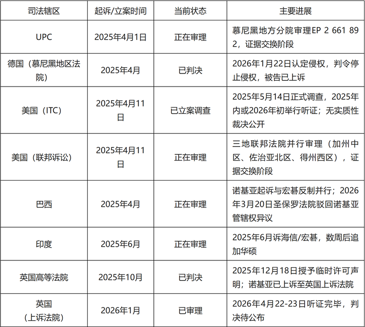 值得注意的是,诺基亚在全球多个司法辖区同步提起了专利侵权诉讼。在德国,慕尼黑地区法院于2026年1月22日认定宏碁、华硕侵犯诺基亚EP 2 375 749号专利,判令停止侵权,并明确表示英国高等法院的临时许可声明在德国不具有抗辩效力。诺基亚在美国、巴西、印度及统一专利法院也提起了平行诉讼。