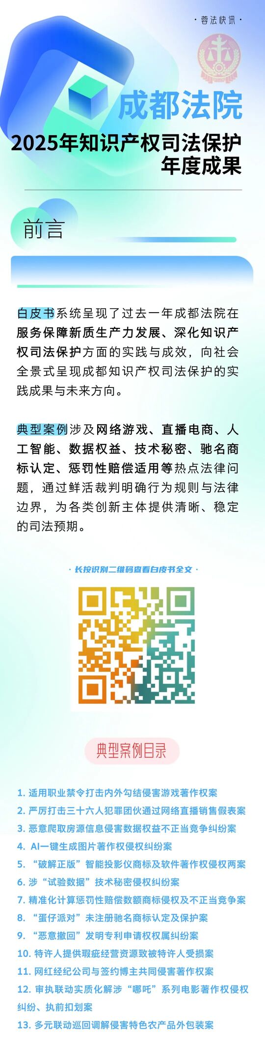4月24日,成都中院召开新闻通气会,发布《成都法院2025年知识产权司法保护状况》白皮书及典型案例,成都中院党组成员、副院长龚成通报了成都法院2025年知识产权司法保护工作情况。