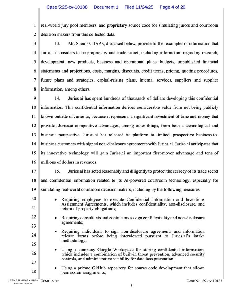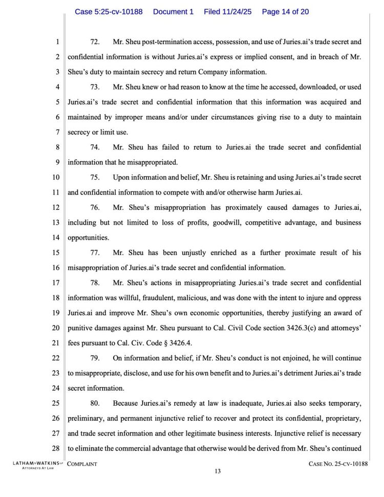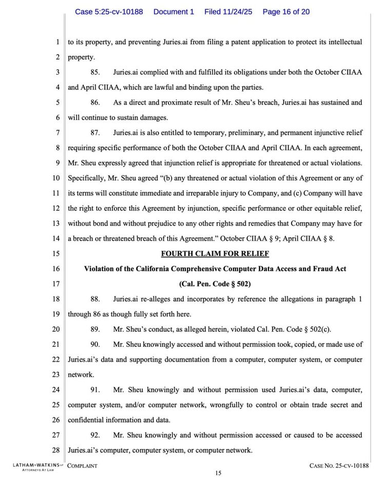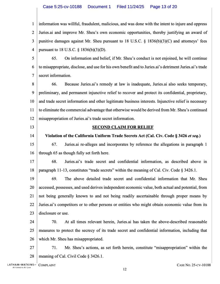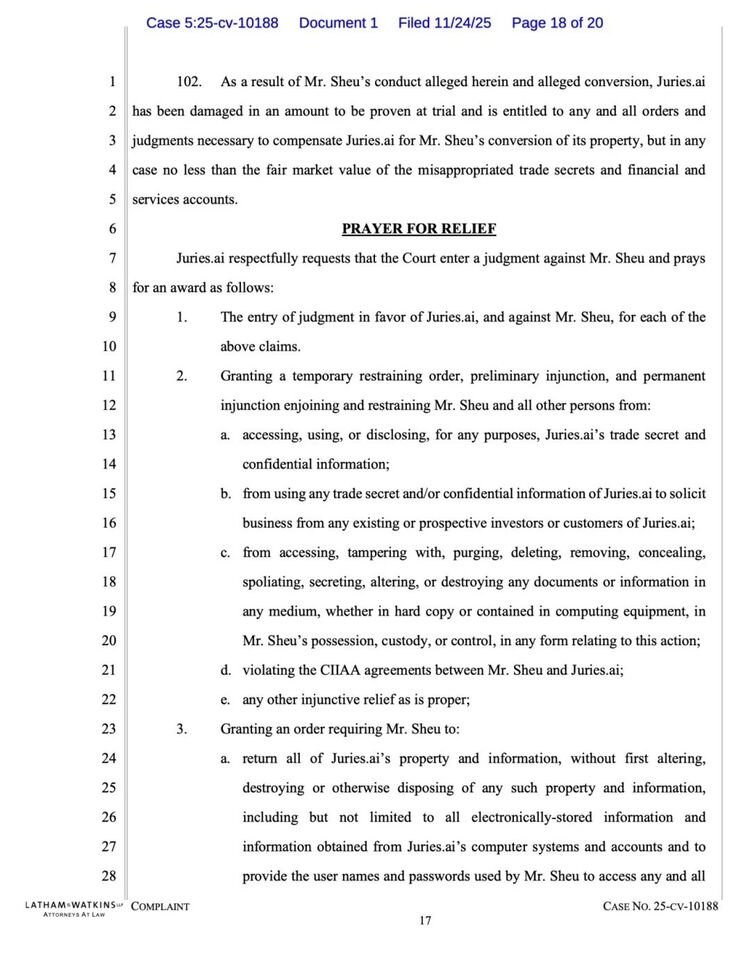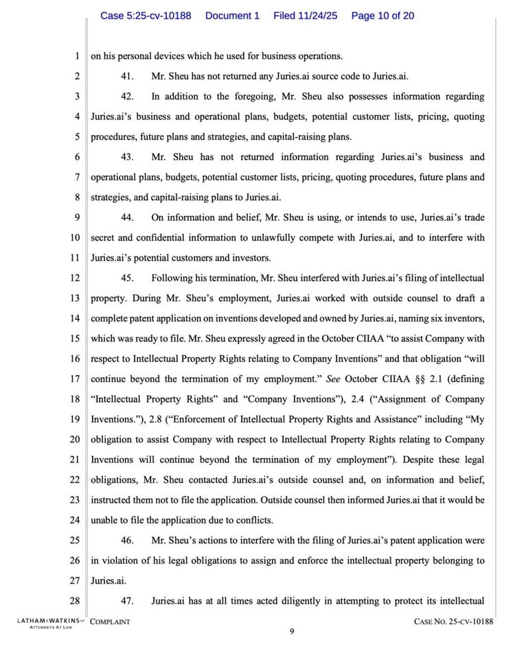 诉状显示,Vincent Sheu拒绝归还公司机密信息,干扰公司专利申请,并接触Juries.ai投资者以推销"实质性相同"的平台。Juries.ai请求法院颁布禁令,禁止许滥用其商业秘密,并索赔未具体说明的金额赔偿。